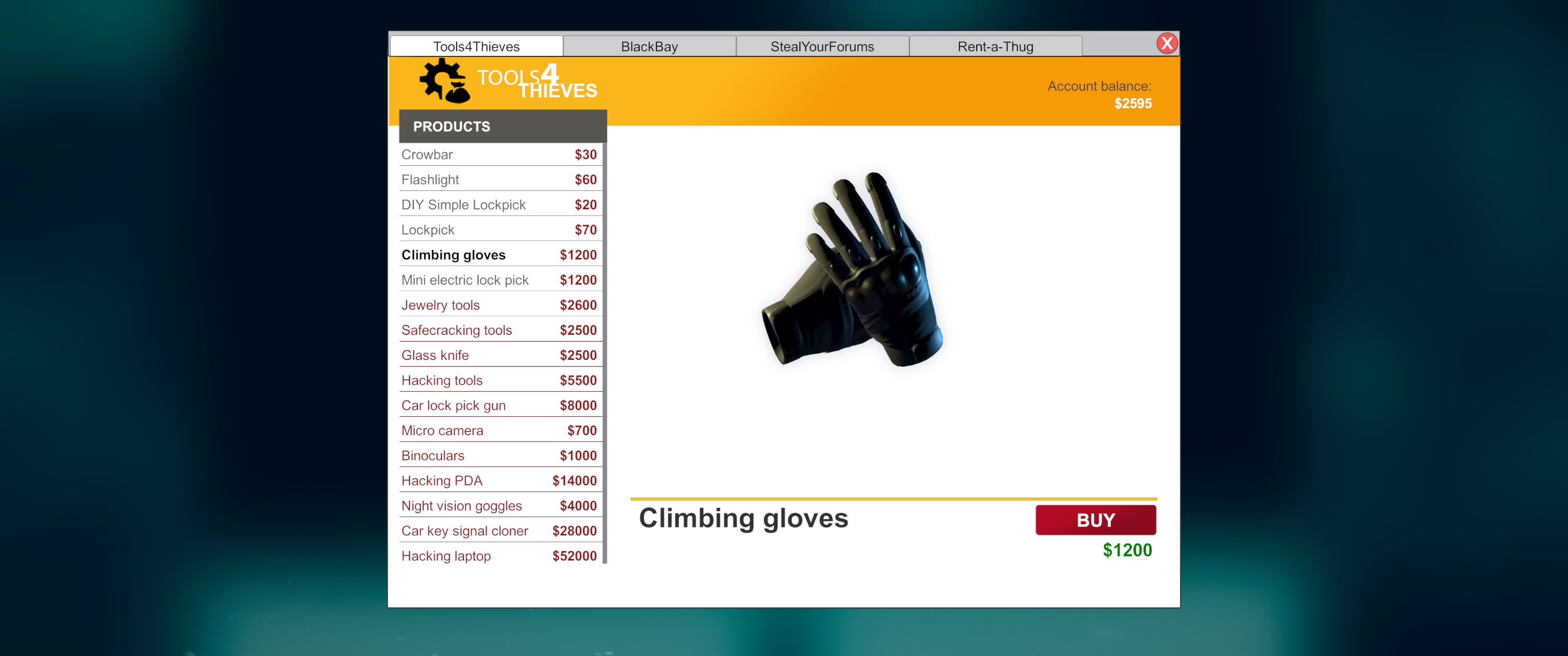 You start with no skills and no tools (other than a less-than-subtle crowbar). Steal a few things, pawn them for cash, buy tools and skills with your profits, and then you can lift more expensive things that are more heavily guarded.