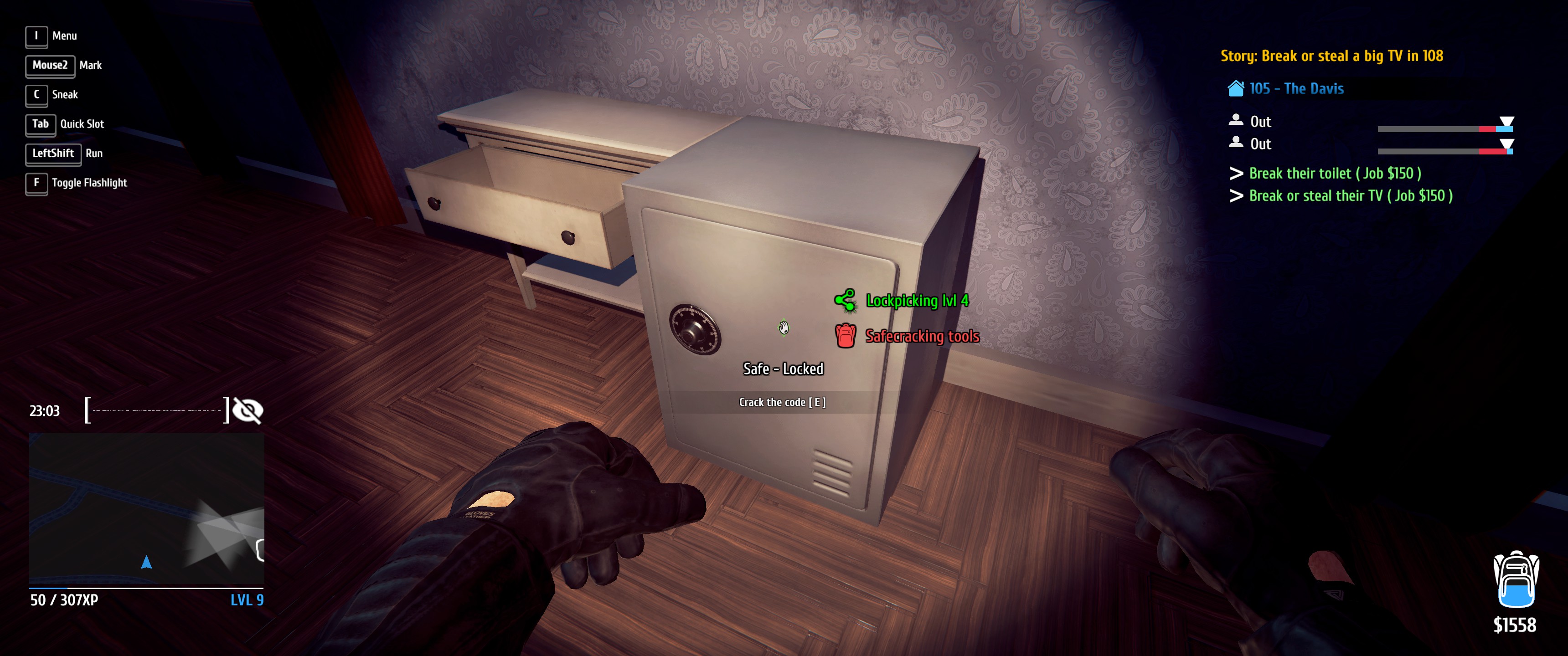 In short, Thief Simulator is only as immersive and challenging as you choose to make it. An optional “hard mode” extends the game’s life somewhat by removing the mini-map and making NPCs more perceptive, but it’s still ultimately up to the player to refrain from abusing the clumsy A.I. if they really want to play the game as it’s meant to be played.