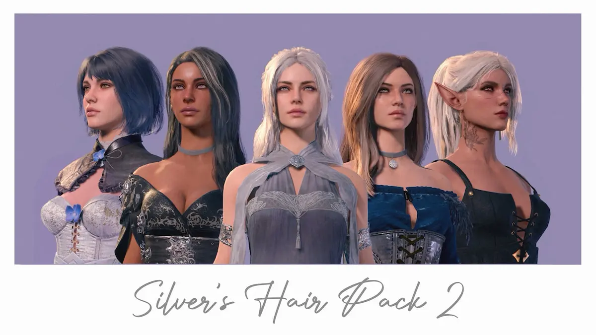 Silver’s Hair Pack 2 is a pack full of glamorous female hairstyles, perfect for Humans, Elves, Half-Elves, Drows, Tiefling, and Githyanki bodies. If there aren’t enough long, elegant hairs for you, this will give you precisely what you’re looking for, with their own physics, custom highlight colors, and icon pictures.