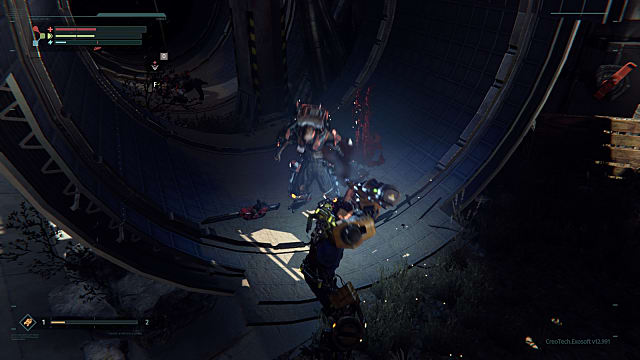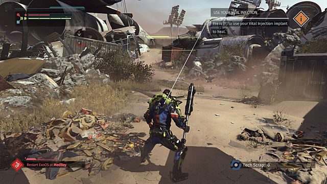 You'll have to make a tactical decision -- return with the amount of tech scrap you've got now that might be enough to upgrade your suit's core, or keep fighting and potentially die and lose it all unless you hack your way back to your corpse?