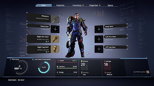 Your starting gameplay style will change a bit depending on which "class" (or in this case, which base exo-rig suit) you choose. Rather than a static clicking option at a character creation screen, the selection is built into the intro as the main character decides whether to apply for the agile and versatile Lynx technician position or the Rhino heavy tech position at Creo.