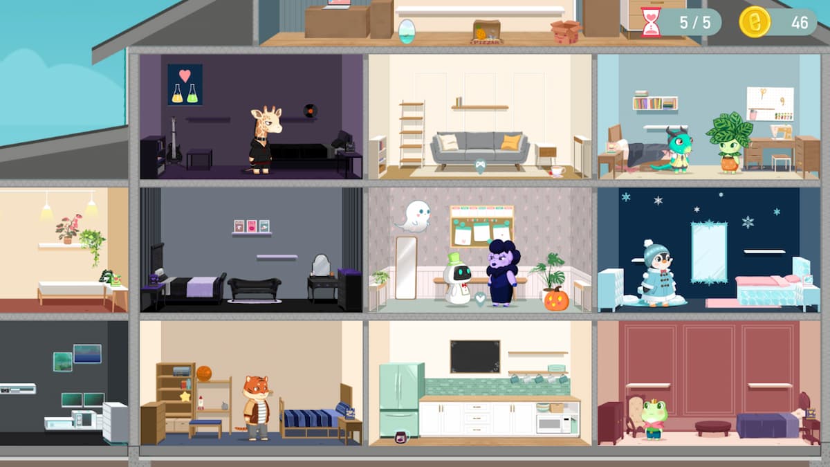 Gameplay is simple enough. After selecting four residents to move into a “definitely not haunted” manor, you’re tasked with growing their relationships. This can be achieved in a variety of ways, including: