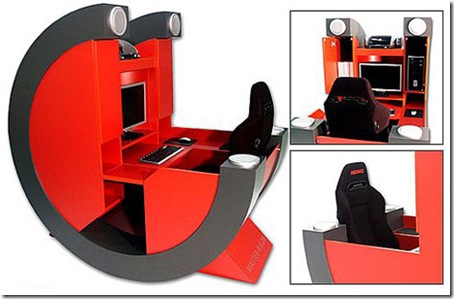 The MWE Emperor 200 is a futuristic workstation featuring three 24" HD LED touchscreens, LED lighting, THX surround sound, motorized adjustments for chair and screens, and air filtration?? I can see Mass Effect fans commanding this one.