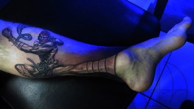 A clever use of angles, this Dhalsim tattoo creates the illusion that the wearer's foot is actually about to cause someone serious pain. Too bad the tattoo wouldn't help him in a real fight.
