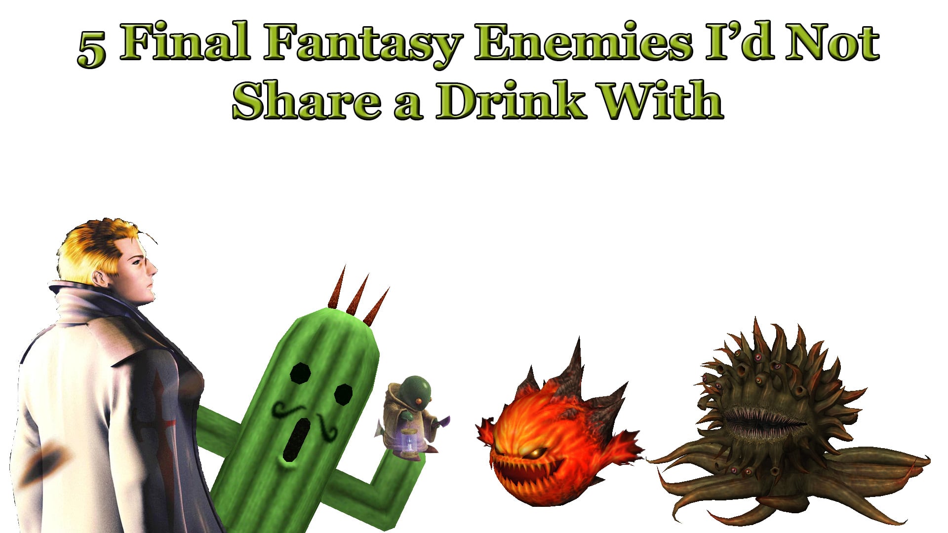 Those faces are of the 5 enemies from Final Fantasy that I would, under no circumstance, share a drink with. Ever. Now, they may not be the same 5 as what you would pick. I do encourage you to share your 5, I'd love to see how close our nightmares are...