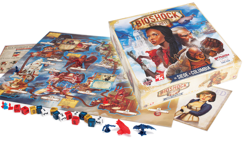 Set during the same time as the video game, BioShock Infinite: The Siege of Columbia focuses less on Booker and Elizabeth and more on the battle between the Founders and Vox Populi. Players choose between one of the two factions and use their unique deck of cards to alter events, strengthen their army, battle Booker and fight for control of the floating city. The game features a navigable Sky-Line, and miniatures like Handy Men, an airship and the Song Bird.
