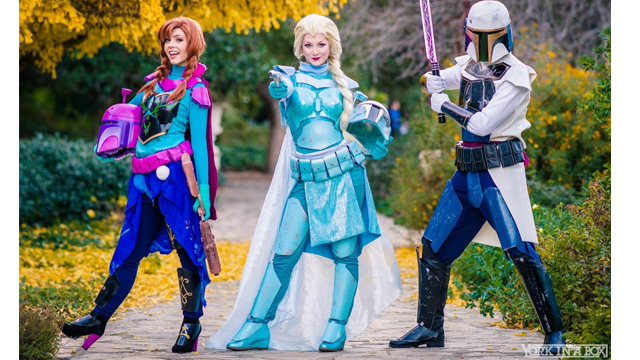 Ever since Disney acquired the rights to Star Wars, cosplays combining various Disney characters with Star Wars characters have skyrocketed. One of the most popular mixes comes for Boba Fett (of course), everyone's favorite bounty hunter. Here, Anna, Elsa, and Hans strut their stuff in modified and Disney-fied Boba Fett armor.