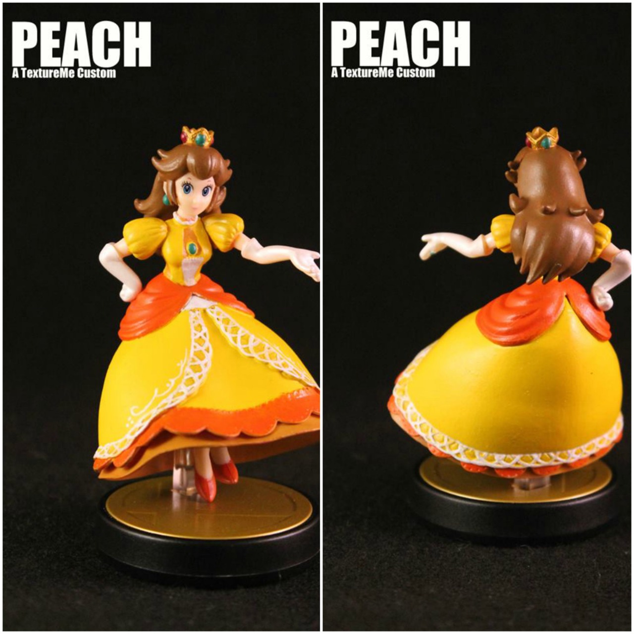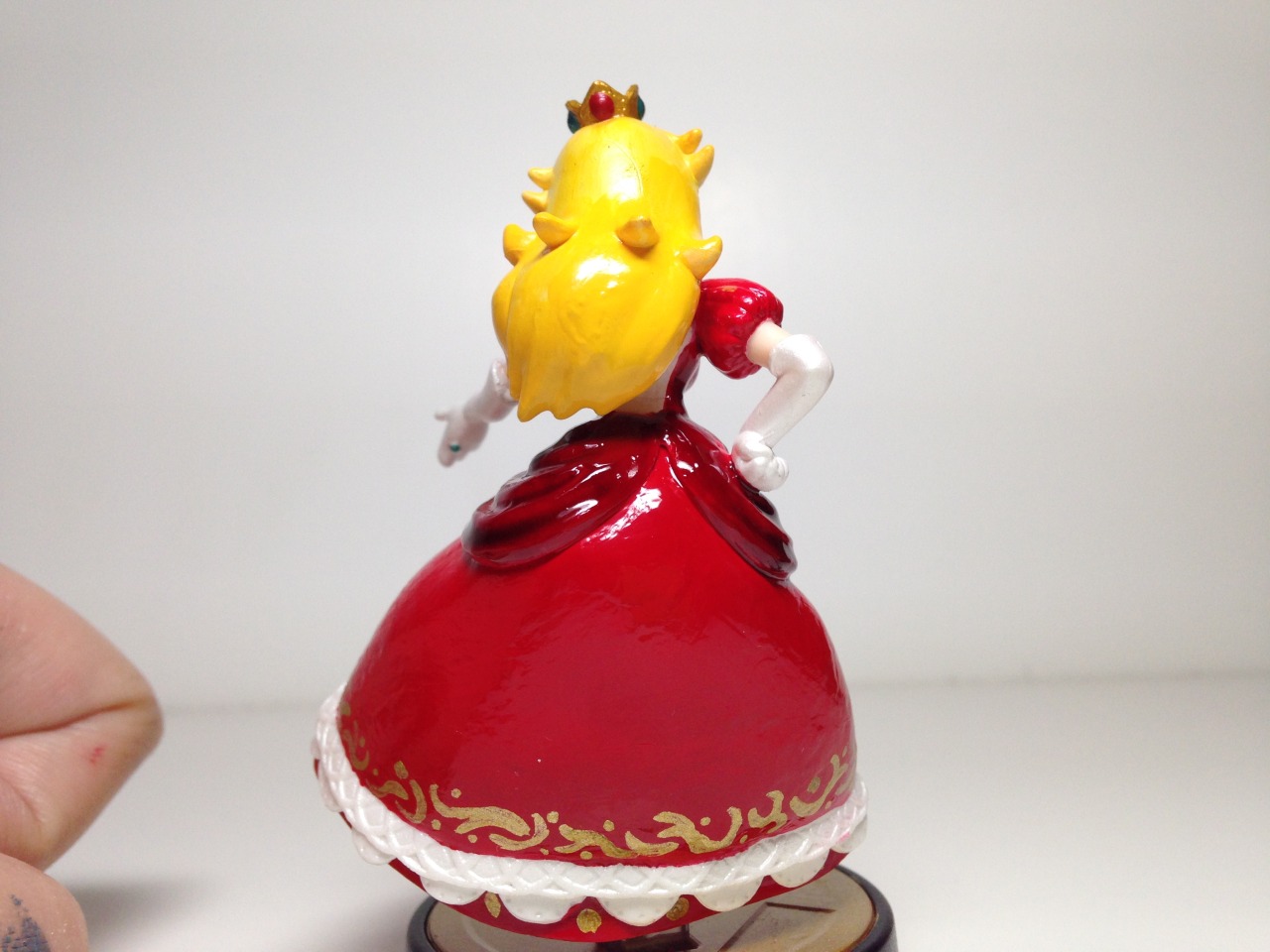 "My personal Peach Amiibo painted in the red costume colors (aside from the pink frill, I liked it better as a white), like the Link one I used a mix of Acrylic and Enamel paints."