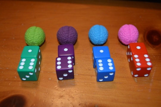 Apparently, Orion already had a game idea brewing in his young mind that I was unaware of. His cousin had a birthday in October prior to the PAX trip and part of the goody bag from the party included several colored brains (it was a zombie themed party). Orion had taken those brains, added some similar colored dice and began the early stages of game development all on his own. Throw in a few basic rules on what to roll to win and he had a foundation to build on. The working title was “The Brain Game” but we eventually changed it because there are a lot of games out there with a similar title.