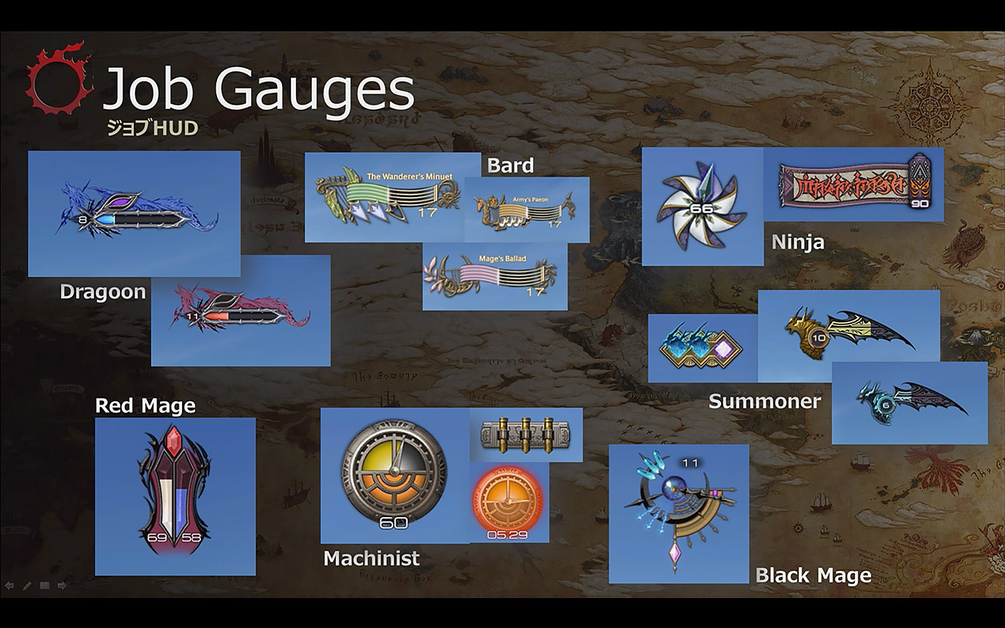 With Stormblood, every job will have its own unique gauge. These gauges are meant to be visual cues regarding your character’s stance and numerical buffs. Simplified versions of the Job Gauges are still under construction, and the developers want feedback from players on how to improve them.