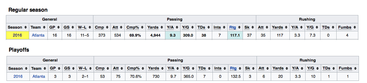 What’s more, his 2016 regular season stats were off the charts, helping him win the NFL’s top regular-season honor. A quick look shows that Ryan had his best regular season in completion percentage, passing yards, yards per attempt, yards per game, total touchdowns, and passer rating (at 117.1).