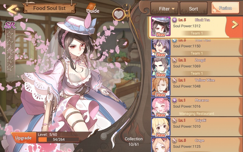 All the typical freemium resources are up for grabs, which are earned through the restaurant portion of the game, with upgrades and other items acquired through battle. Of course you also summon “food souls” that are creatures of randomized strength, then upgrade, fuse, and evolve them in various ways.