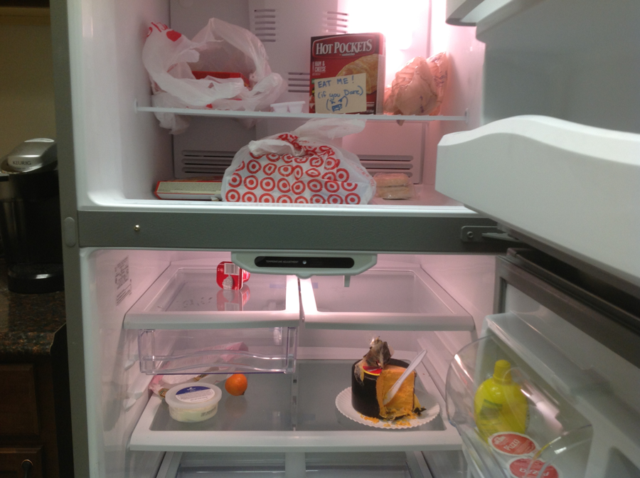 The fridge at the Guild Launch/GameSkinny headquarters, complete with strange wheel of cheese and possibly dangerous Hot Pockets.