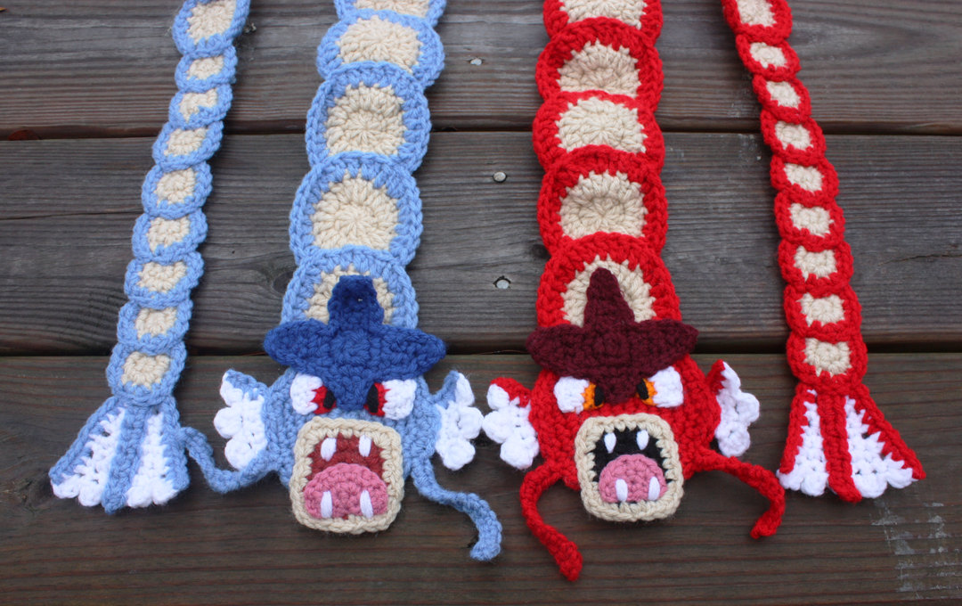 As the picture shows, you can get the traditionally colored, blue Gyarados scarf or the shiny variant, red Gyarados scarf. But wait there's more! If that wasn't already cool enough the scarf is customizable and custom-made upon ordering. So, if you'd like different colored eyes or a different colored Gyarados, then ask away.