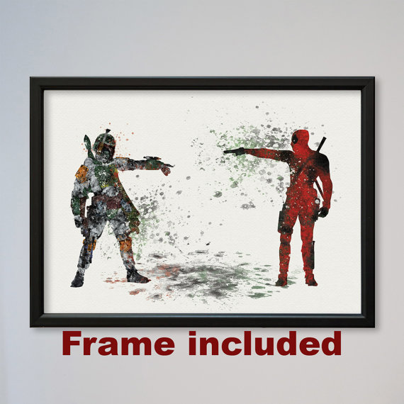 Do you or your giftee get geeked on Boba Fett and/or Deadpool? If so, this standoff mashup painting is perfect! Not only does it come with a frame (your choice of black or white, but the print uses HDR ink, which will last for over 100 years. You can get the painting in sizes ranging from 5.8" x 8.3" - 8.3" x 11.7".