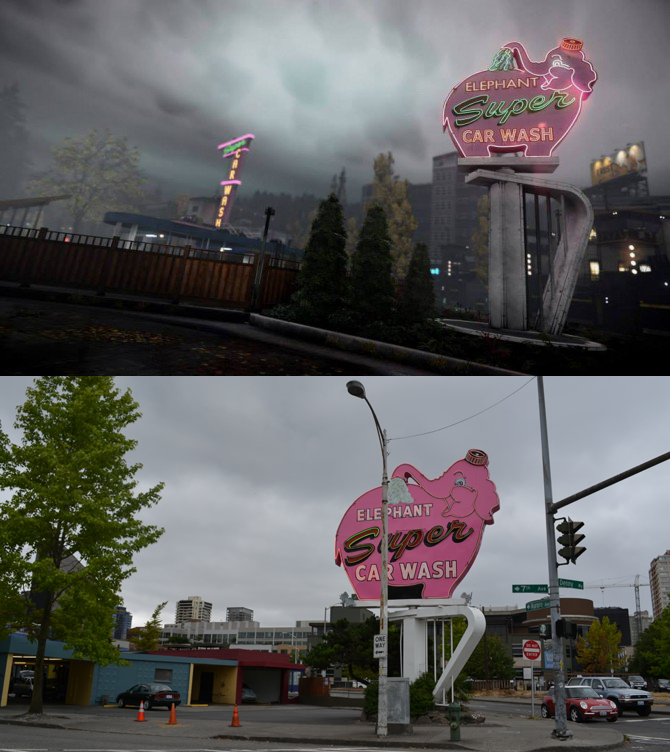 Seeing pink elephants? Elephant Car Wash has been a part of Seattle since the 1950's and their signs have become somewhat of a landmark themselves. Neon pink elephants can be found all over Seattle, but the version featured in Infamous: Second Son is most likely inspired by their Downtown location.