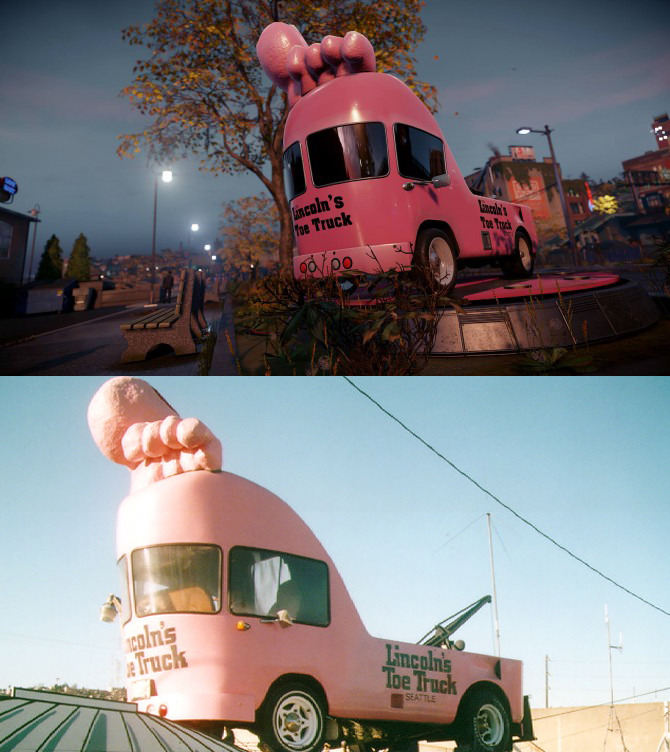 One of the more unique Seattle icons to be featured in Infamous: Second Son is Lincoln's Toe Truck. There's actually more than one of these pink, Monty Python-esque vehicles around Seattle but the truck featured in the game is modeled after the one that stood outside of the Lincoln Towing yard for so many years.