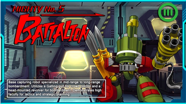 The first Mighty Number is weak to Aviator’s power. He’ll begin each attacking phase by engulfing his body in fire. Afterwards depending on your distance he’ll charge to the opposite side of the room. He’ll try to charge you or explode near you. It’s easy to move to the opposite side while chipping his life away.