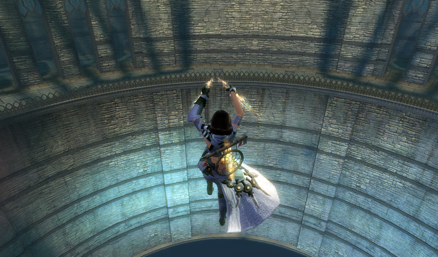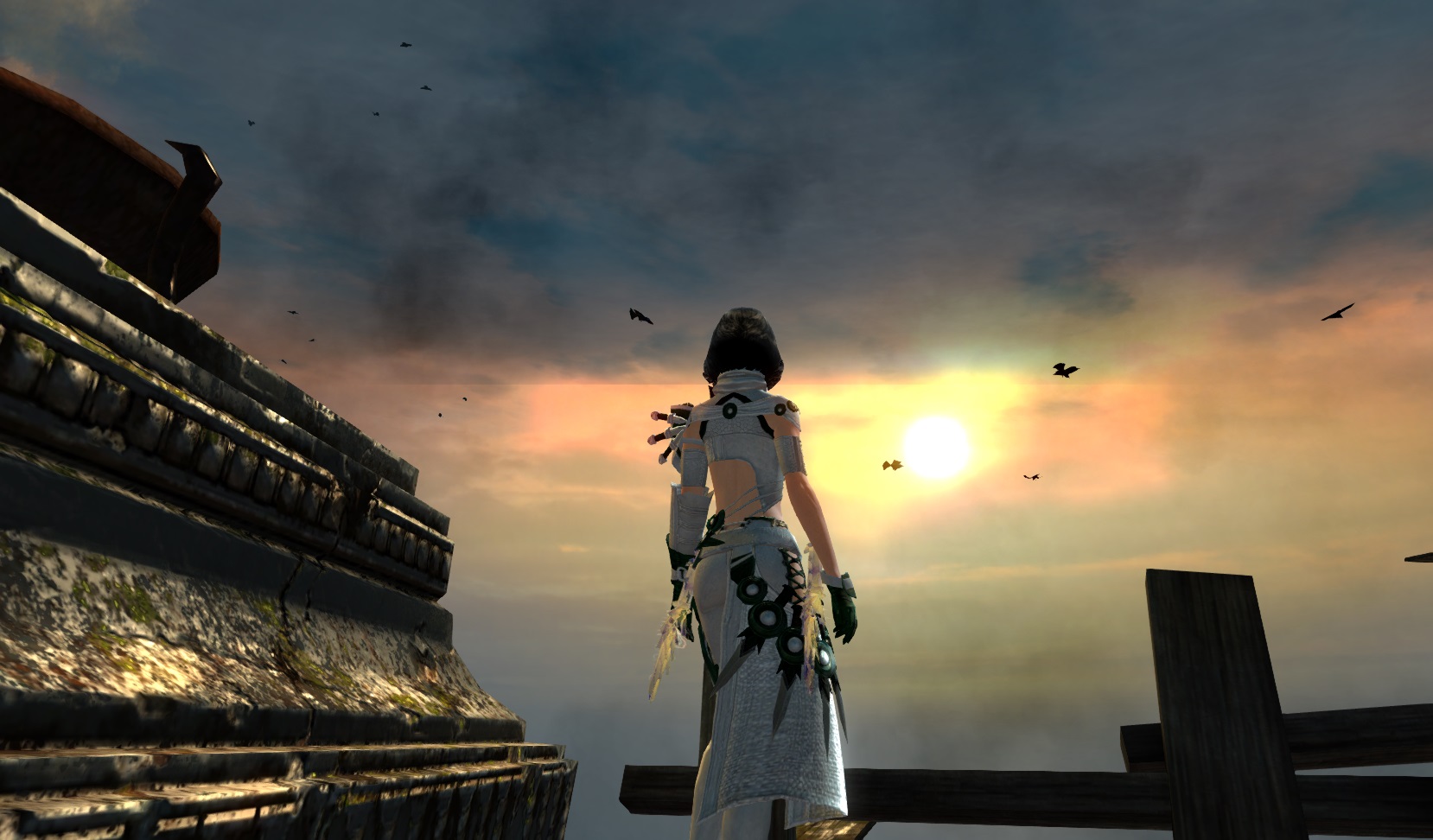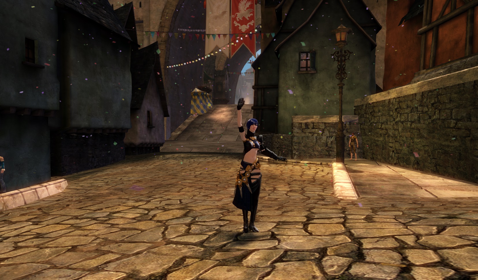 If there's one issue I have above all others with this armor set it the gloves and shoulders. I absolutely LOVE the WvW gloves- I'm not going to lie. I just think they're badass. Okay? But as you can see, the oversized glove is on the same side as the shoulder- a problem in which I could fix. Maybe I'll invest in some new gloves- maybe. (Also, like the new 'do? The bob just didn't cut it.) I took this unimpressive shot in HotW, where I would, yes, I did do this- make my GUILDIES stop for a few seconds to snap screenies. (Love ya, iLL!)