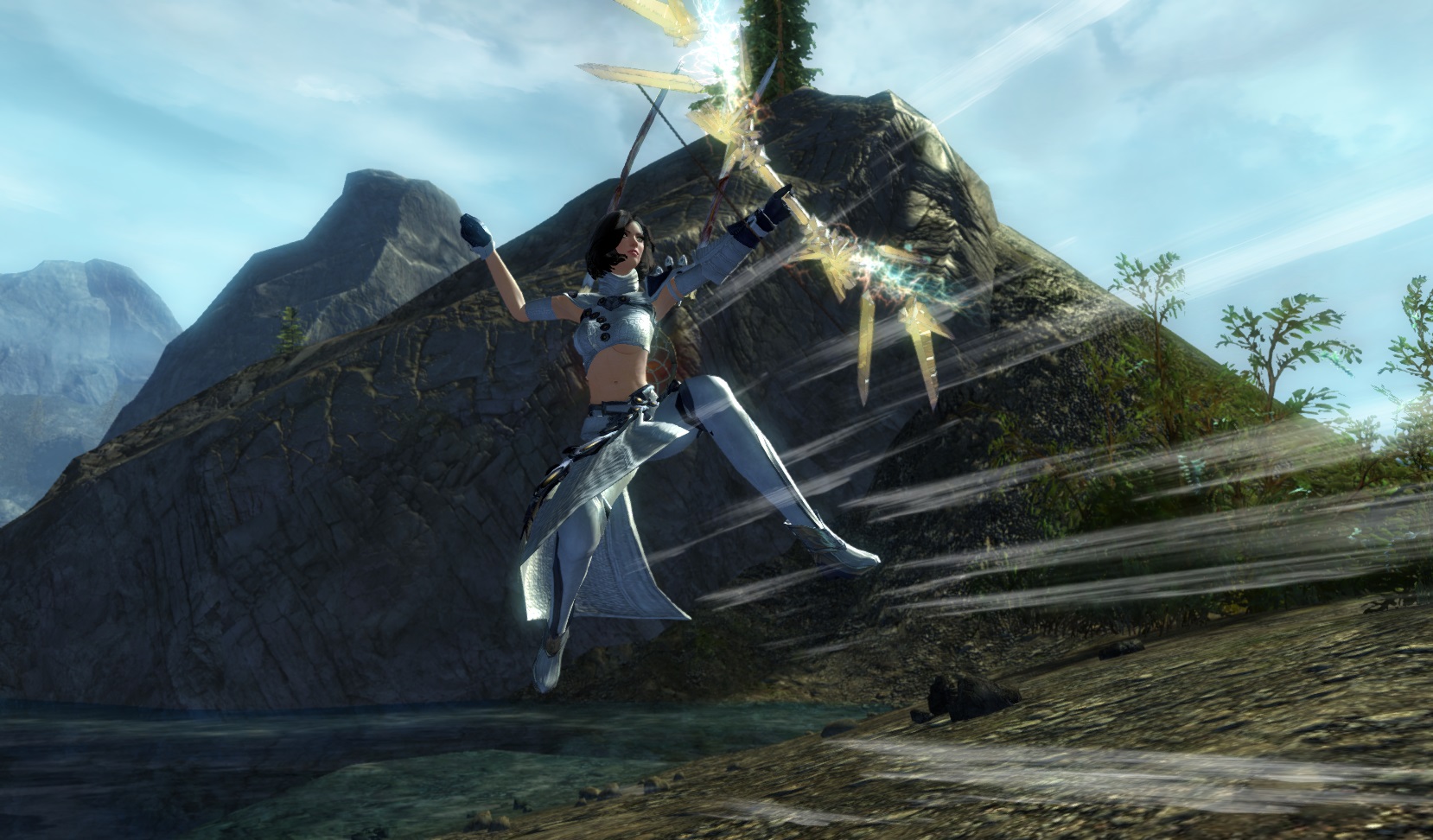 This is my prized screen shot. Showin' off my Zenith shortbow along with the newly acquired Tier 3 Cultural chest for human medium (I know, I know- everyone and their MOTHER has it- well, almost). This was taken at the Nonmoa Waypoint in Timberline falls. I tried MULTIPLE times to get some action shots- this was one of the most successful.