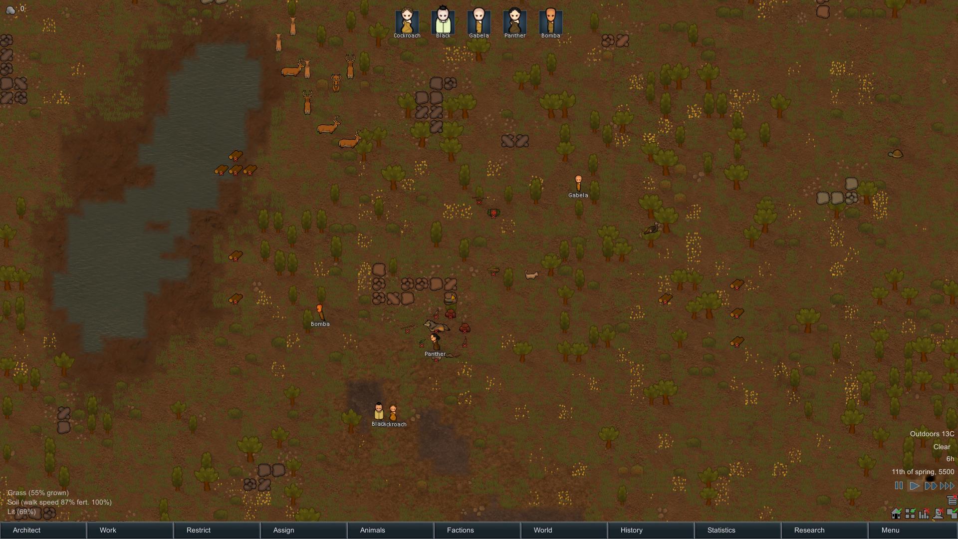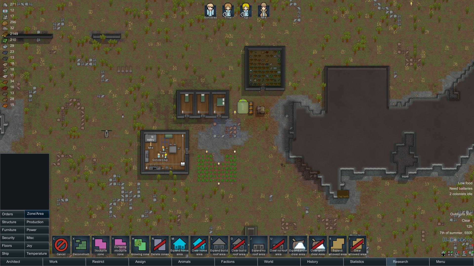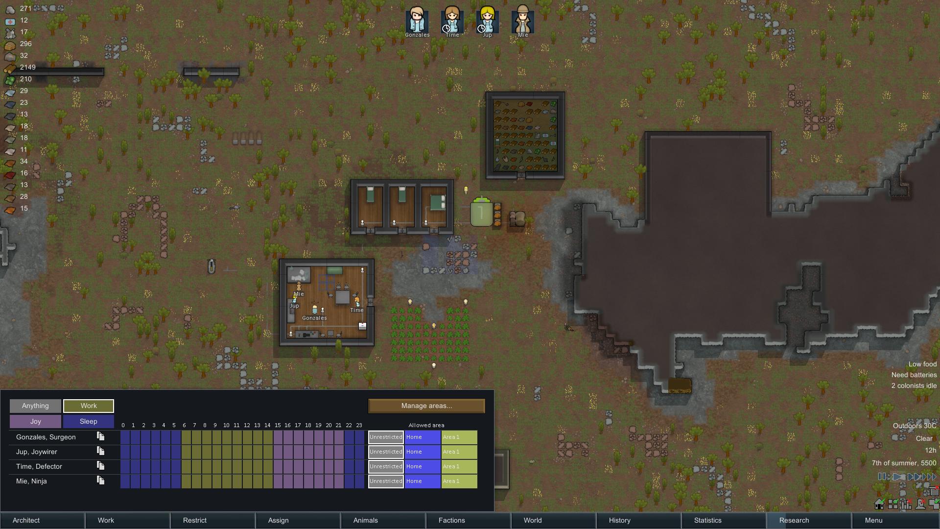 There are a lot of activities the colonists can do, like mining, hunting, researching, construction, crafting, growing plant life, cooking, etc. Leading colonists to do what best suits them and timing it right is the recipe for success. For example, if you don’t hunt or cook enough food, the group will become low on food or they will begin to starve.
