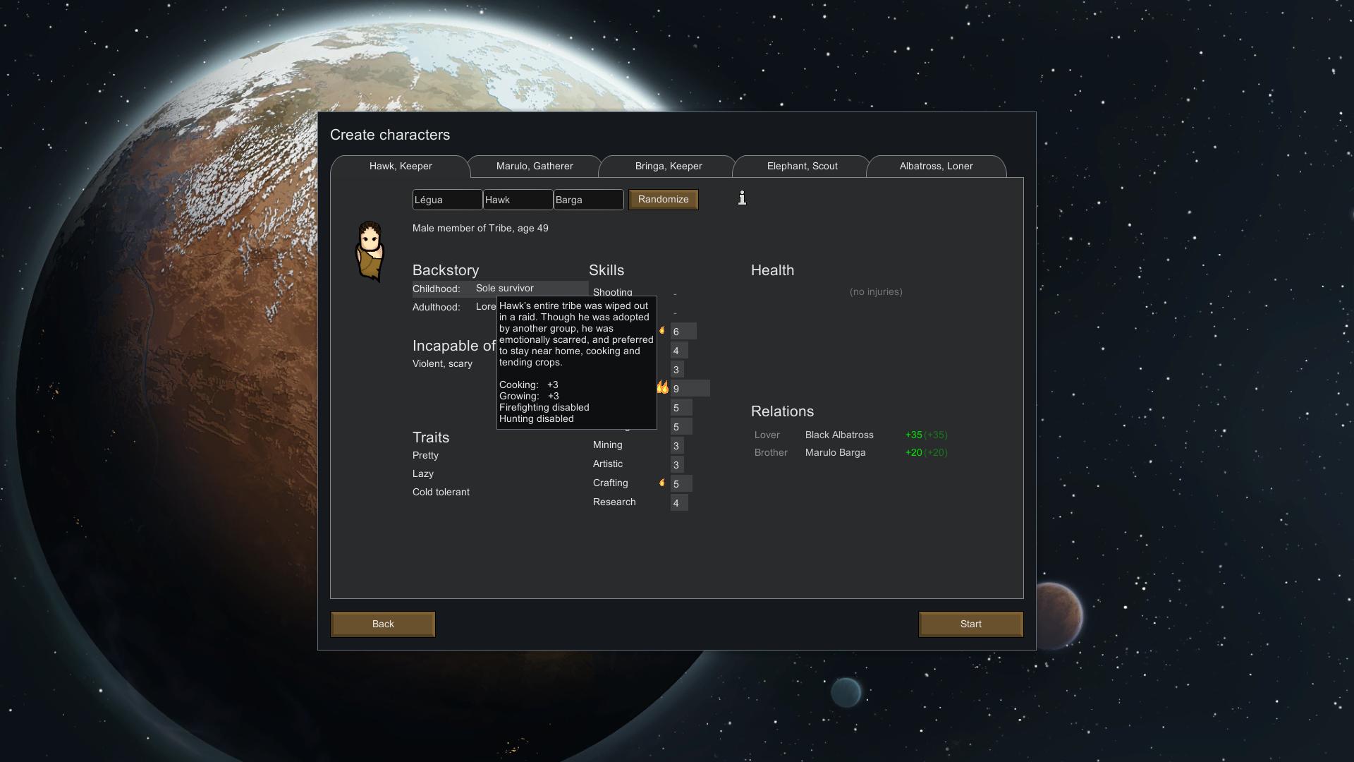 Every single little detail of each character can potentially change how a game plays. Creating a group that can cover the strengths and weaknesses of each colonist is essential. There needs to be a balance in order to be able to build effectively.