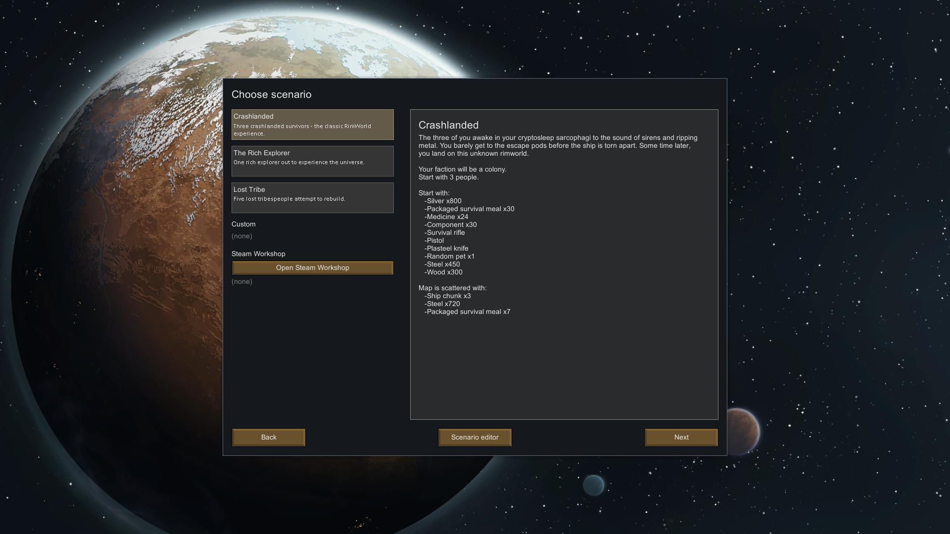 RimWorld has also added in a scenario editor allowing for players to create their own scenario. Also, Steam Workshop is implemented into the game, allowing for players to share and download their own scenarios as they please.