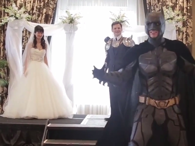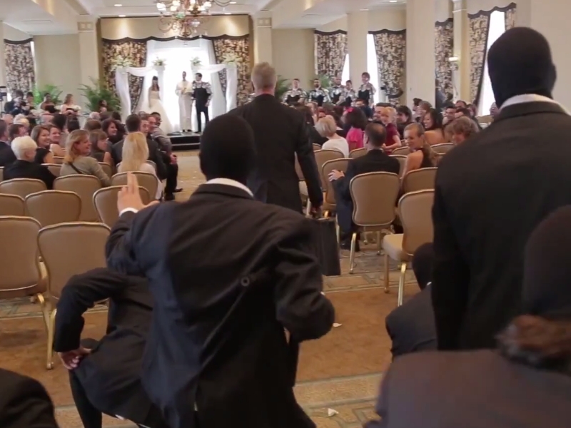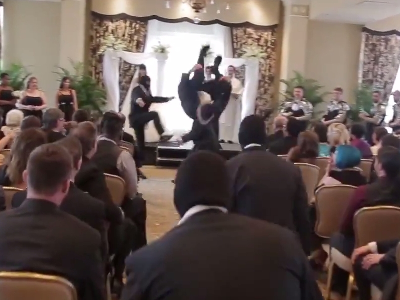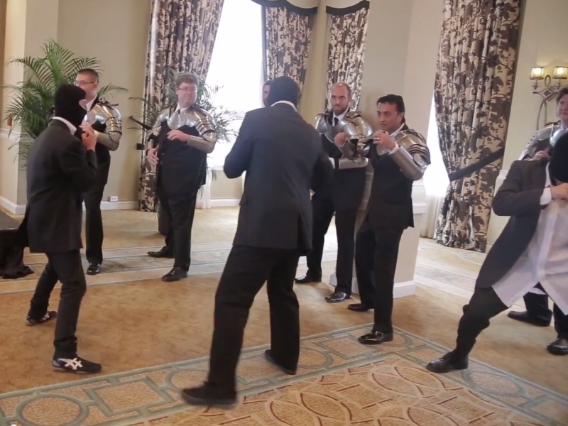 The ninja squad squares off against the groomsmen while their boss heads for the bride. (Side Note: Groomsmen who had to rent cummerbunds instead of plate armor may commence envy now.)
