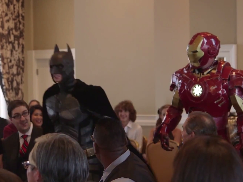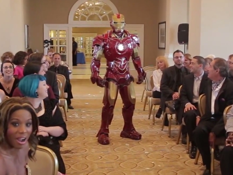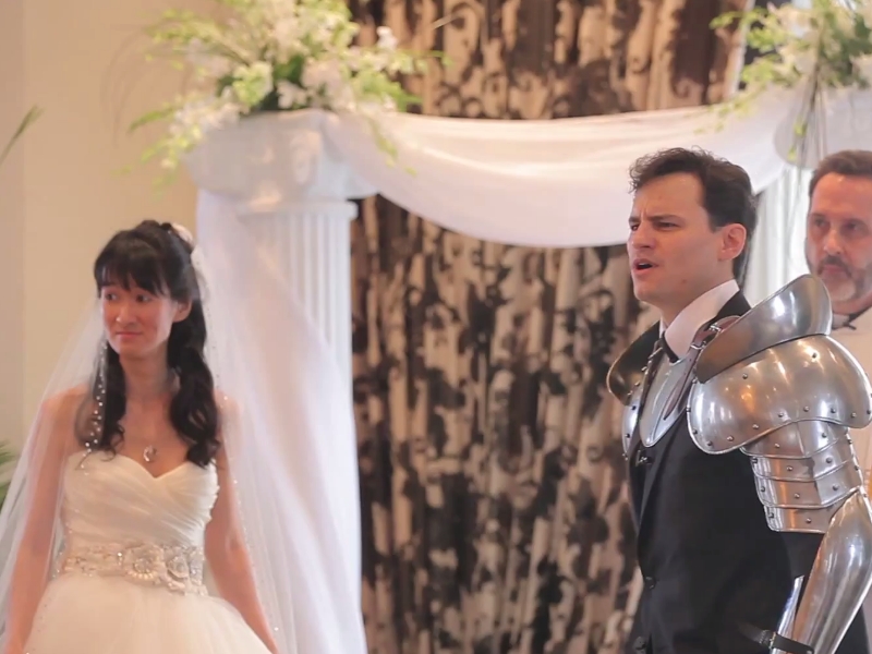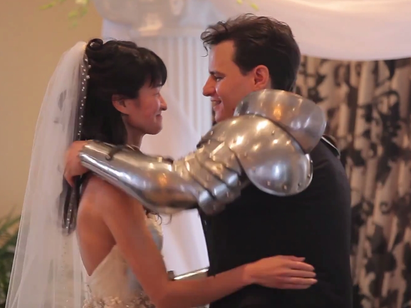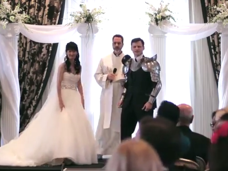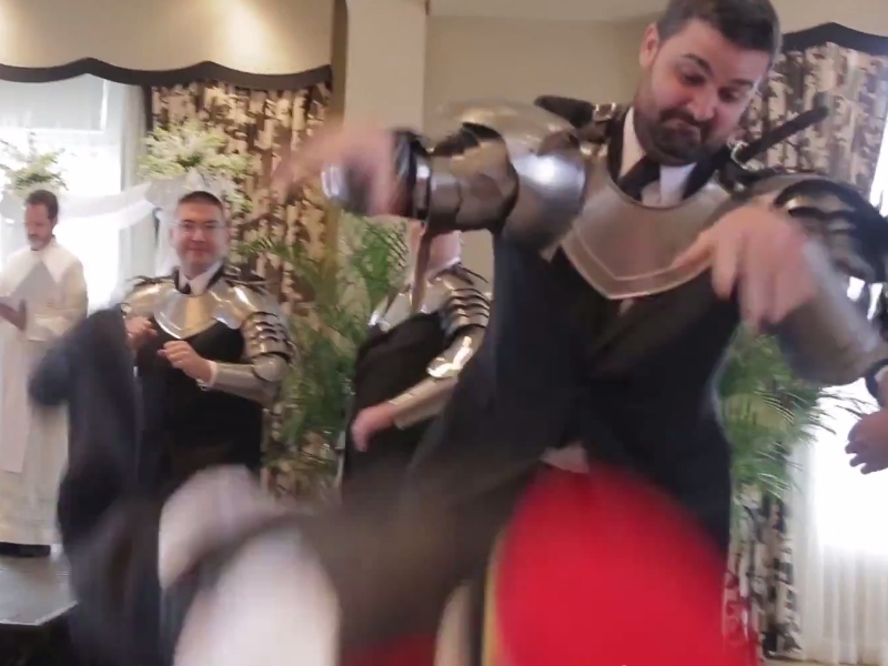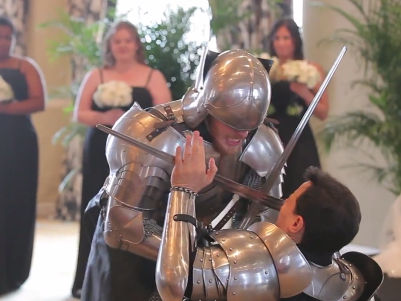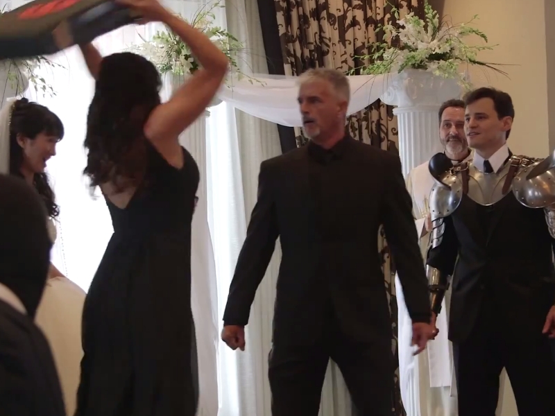 And it's a good thing, because otherwise this would have been a pretty one sided fight. Meeting in the middle of the aisle, the groom and knight battled until they reached the front of the room.