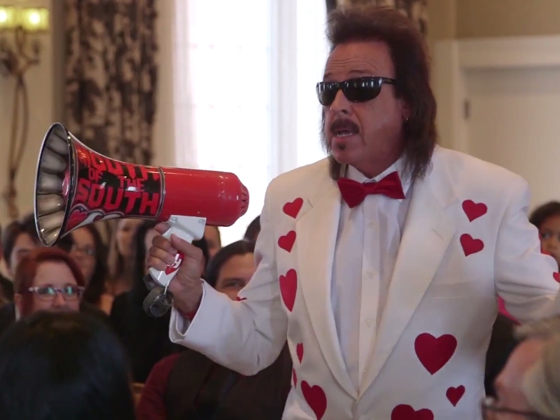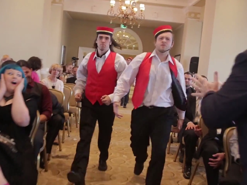 And in a showing of true togetherness, the bride and groom chuck the last bellhop standing off their ceremony platform.