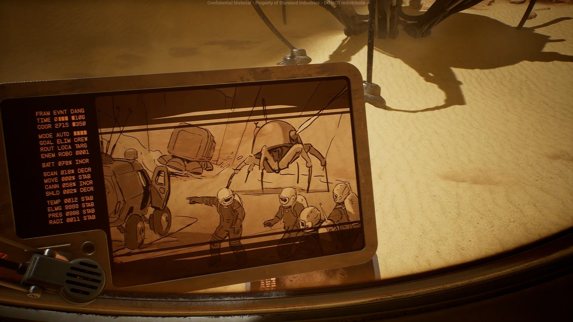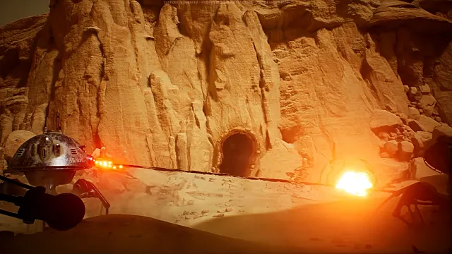 I begin my demo cruising an interstellar rover toward the last known point of another crew. It’s bright, and the sun is high in the air over a desolate canyon. Strange columns of brown and red stone rise around me, and a deep, unnatural gouge in the canyon wall creates an unsettling “otherness” to the space.