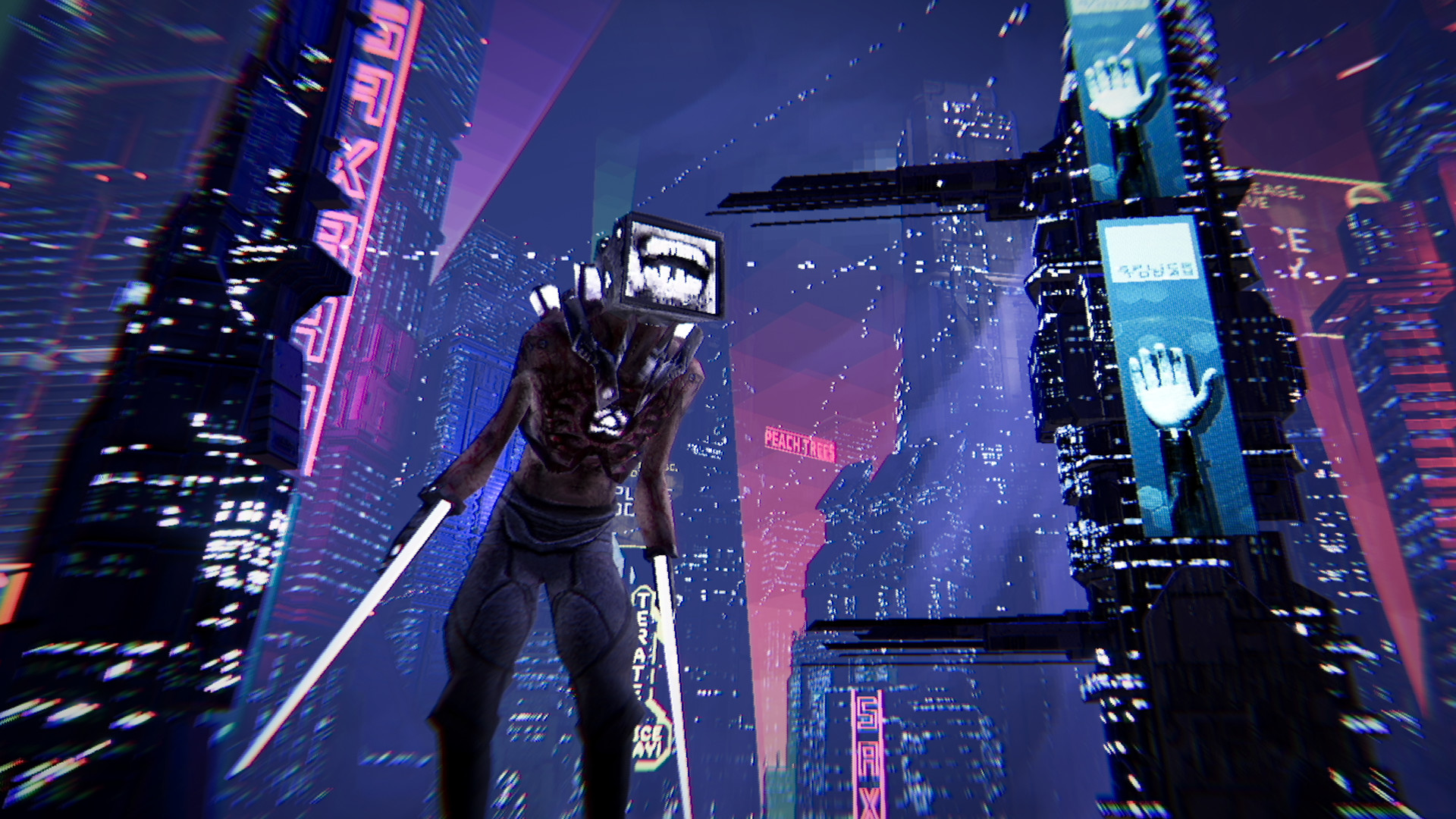 Combat is fast-paced as you shoot your way through waves and waves of horrific cyberpunk monstrosities that have taken over sections of the city. Movement speed is high and each gun packs a real punch, but the true cherry on top is the player character’s chainsaw leg.
