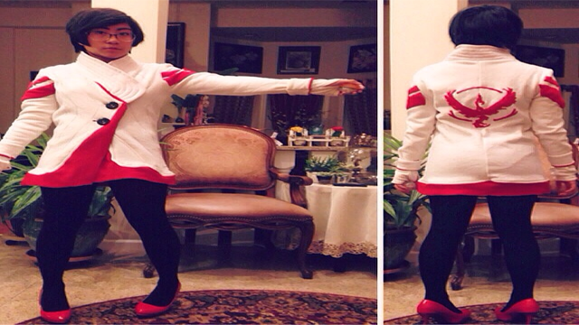 Switching gears, NipahCos has brought to life Spark, Team Instinct's Leader. Clad in black and yellow, he holds a Pokemon egg lovingly. Great job NipahCos -- your Spark is just electrifying.