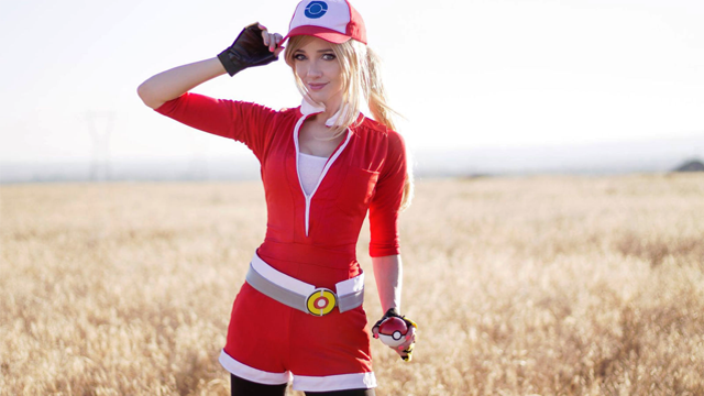 Cosplayer Lyz Brickley brings us a smashing Pokemon Trainer cosplay. Searching for her next Pokemon in the tall grass, she shows off a red (Valor-themed?) costume. Ensuring the best grip on her Poke Ball, fingerless gloves bring unique style to her trainer.