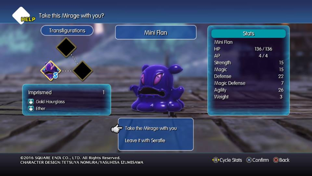 Mirages you capture come in one of four sizes, from small to extra large. Mirages from small to large can be stacked atop one another and the game’s main characters for stats, skills, and elemental resistances. Extra large Mirages are used solely for combat summons, as they are too big to stack.