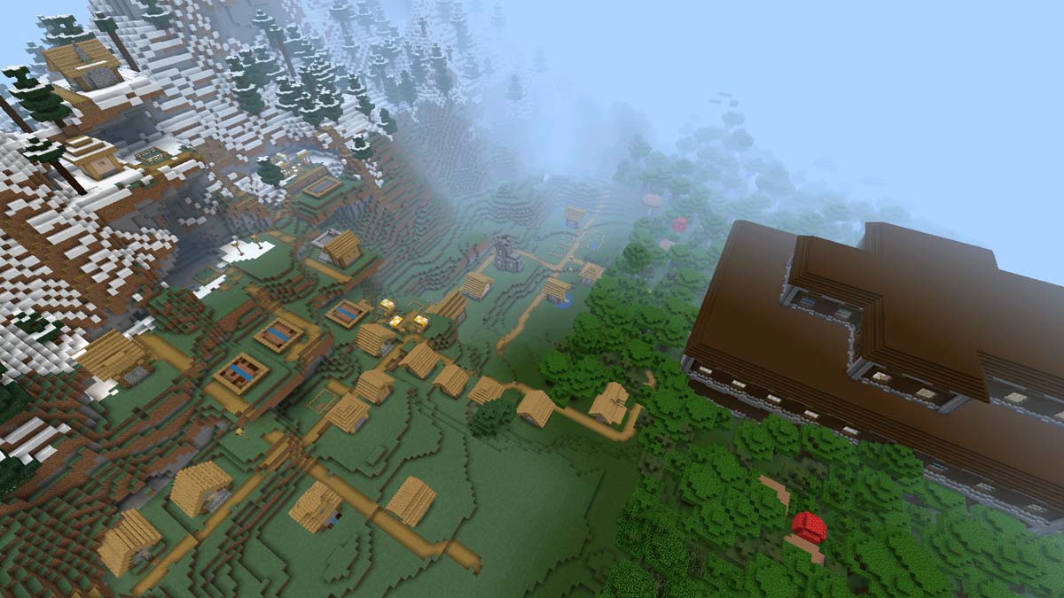 Ring mountains are some of my favorite new things in Minecraft PE. In this seed, I was lucky enough to spawn right inside a mountain ring, which had not only a nice village but also an entire woodland mansion. Fortunately, there’s a blacksmith in the village, so I could easily make weapons and tools.