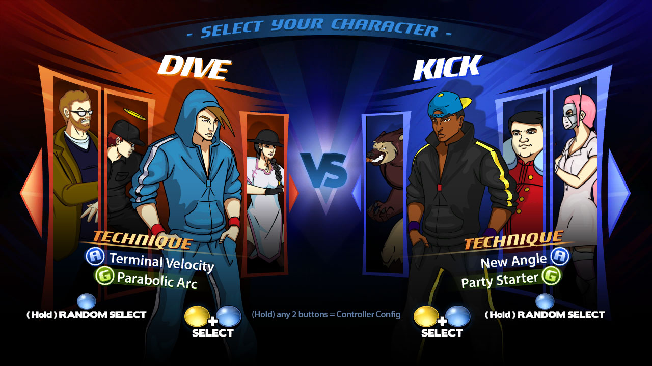 Divekick is both a great fighting game and a great comedy game. It's about as simple as a fighting game can get without being mindless (or being Evil Zone). There are no combos, no complex six-step inputs, and not even a movement stick. You have two buttons in total, and all you can do is dive and kick -- just like the title implies.