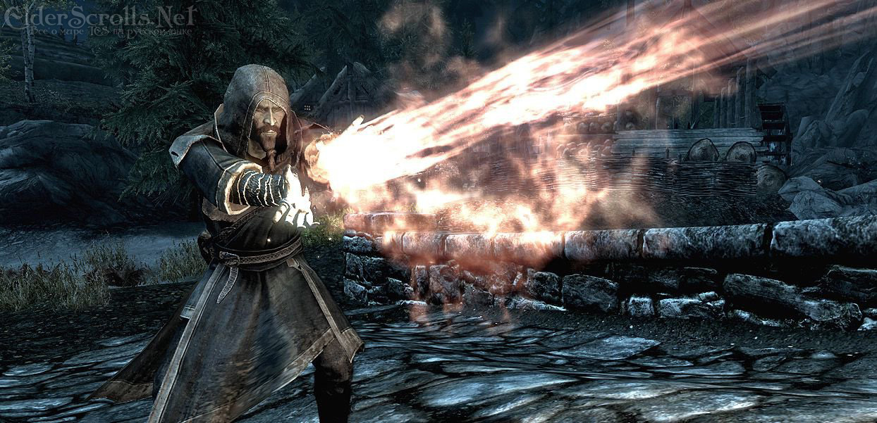 Skyrim gives you several opportunities to burn down your enemies. Rather than having to wait for a sunny day to burn bugs with a magnifying glass, you can just shoot fire out of your hands.