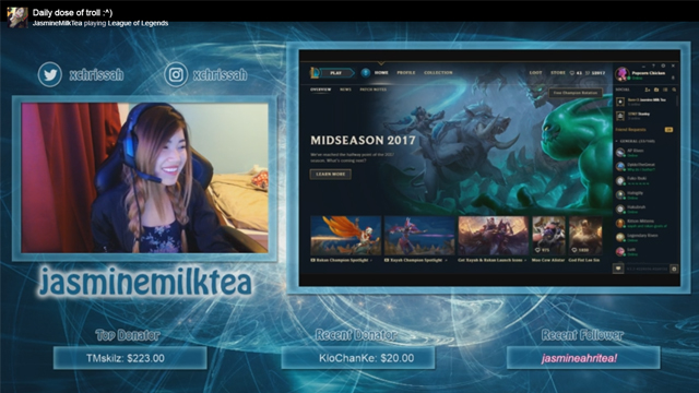 JasmineMilkTea is a platinum ranked player who also focuses on chat interaction. She is a full time streamer who rewards her viewers by letting them accumulate chickens, which they can turn in for rewards.