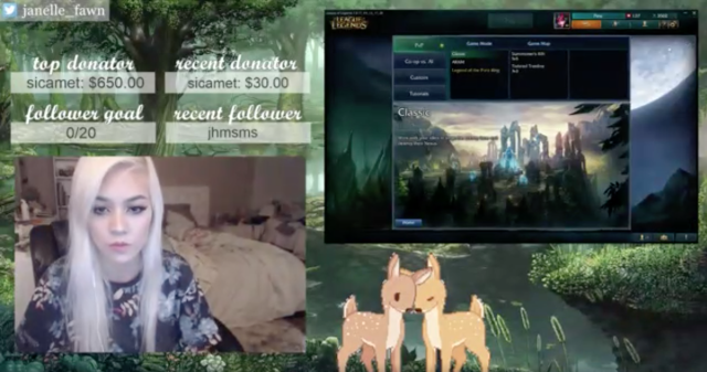 Janellefawn is an interactive streamer. Not only does she play League but she interacts with her chat, responds to viewers questions and has a good personality overall. She is a cosplayer. watches anime, and reads comics, among other hobbies. A gold ranked player, her stream is a delight to chill in.
