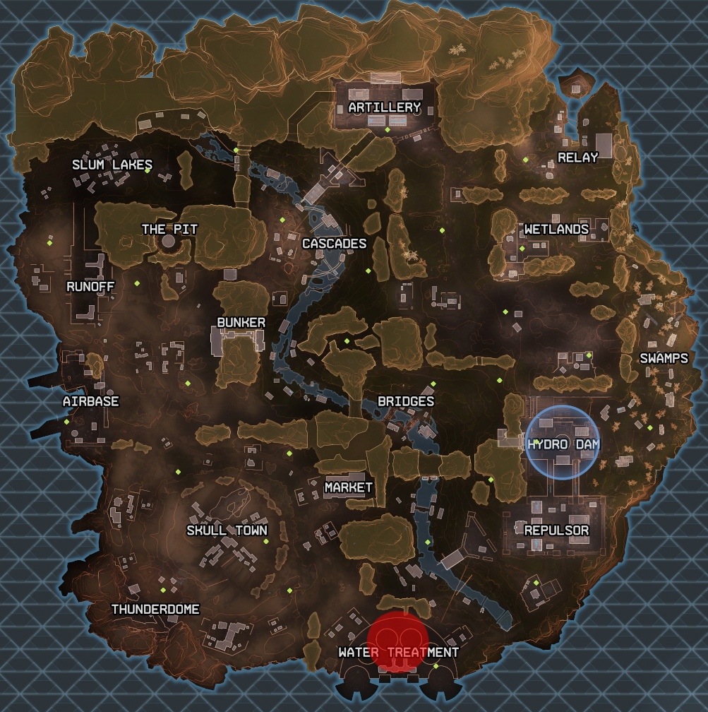 The most southern shore of Kings Canyon hosts a massive Water Treatment facility that is actually very similar to Swamps in terms of playstyle. Ziplining works here just as well, and if you like to loot in relatively empty locations, then this one is just perfect.