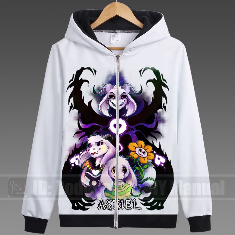 Hoodie lovers unite! You can never go wrong with an awesome hoodie. Personally, I'd suggest owning one for every occasion. This particular hoodie -- which is unisex, so you only need to worry about the size -- is a 60/40 cotton-polyester mix in white. It features some cool looking art of Asriel in all his forms -- as well as his rather sinister-looking Flowey-form.