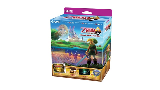 This edition of A Link Between Worlds was only ever released for the GAME chain of stores, a retailer in the UK, whose branding also appears on the box. There wasn't much to it -- a download code for Link's Awakening DX and a humongous A0 poster (shipped separately) featuring the Master Sword. However, it also included a small treasure chest which played the signature treasure sound upon being opened and, as an additional bonus, stored up to five 3DS game cartridges.