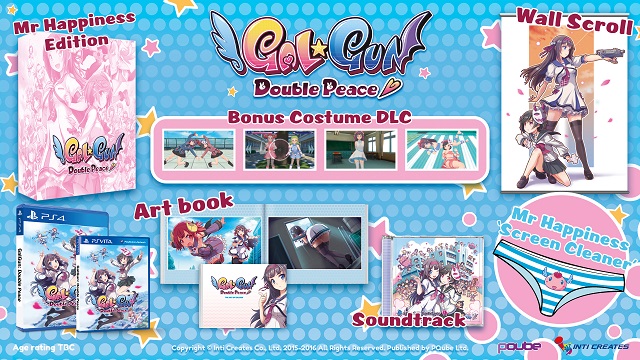 At first glance, there is nothing significant about Gal Gun's Mr. Happiness Edition -- some DLC costumes, a soundtrack CD, and a wall scroll featuring two girls. It also included a pair of panties. Some developers seem to have a thing for underwear, though fret not, it's actually just a microfiber cloth for cleaning the screen of your device. Which is still weird considering the main objective of the game is to rub girls. Oh, Japan....