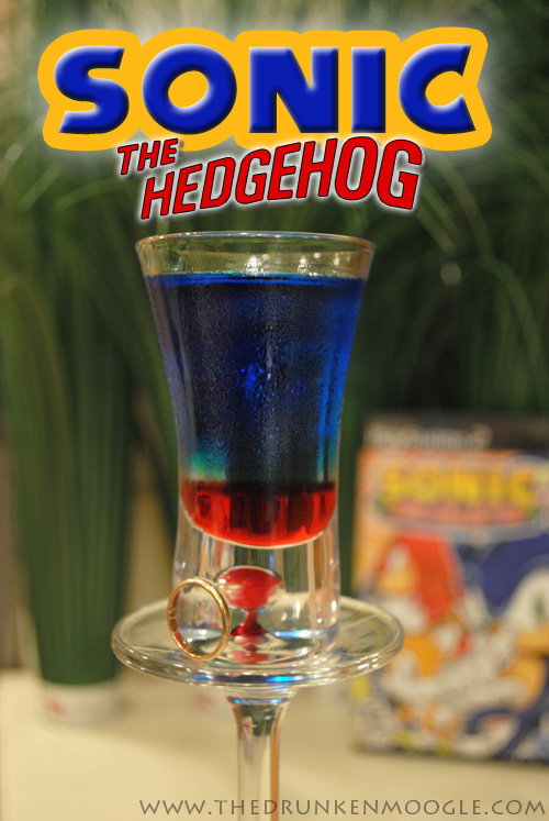 I feel like giving either Sonic or Tails any amount of hard liquor would only end in high-speed disaster, but gamers who can still remember playing the original Genesis titles should have a nostalgic good time with this layered drink. Mix together: