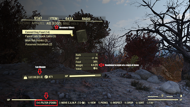 It's no secret that Inventory tab in Fallout 76 is flawed, as it doesn't show you data on items weight and it has no detailed filters for food and weapons. With the help of this mod you will have all this info included in a very natural way.