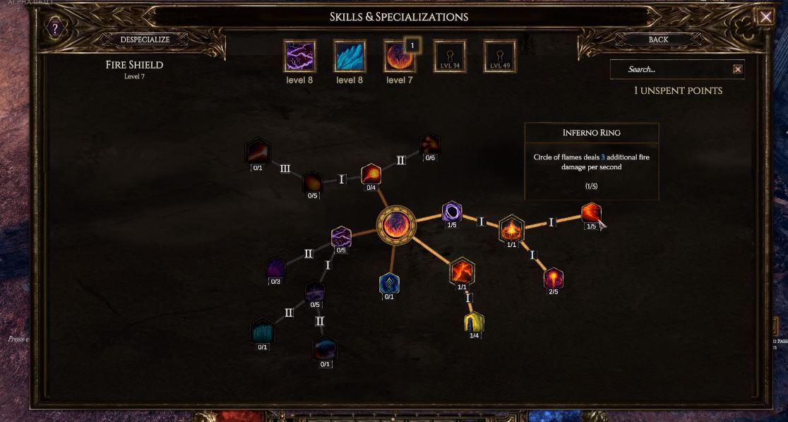 For example, the spell above shows a tree where that makes the fire shield do more damage to surrounding enemies. But of course, that's just only one option; there are a ton of other options like increasing shield elemental defense, increasing the radius of which enemies can be burned, and even increasing the number of times where enemies can be caught on fire.