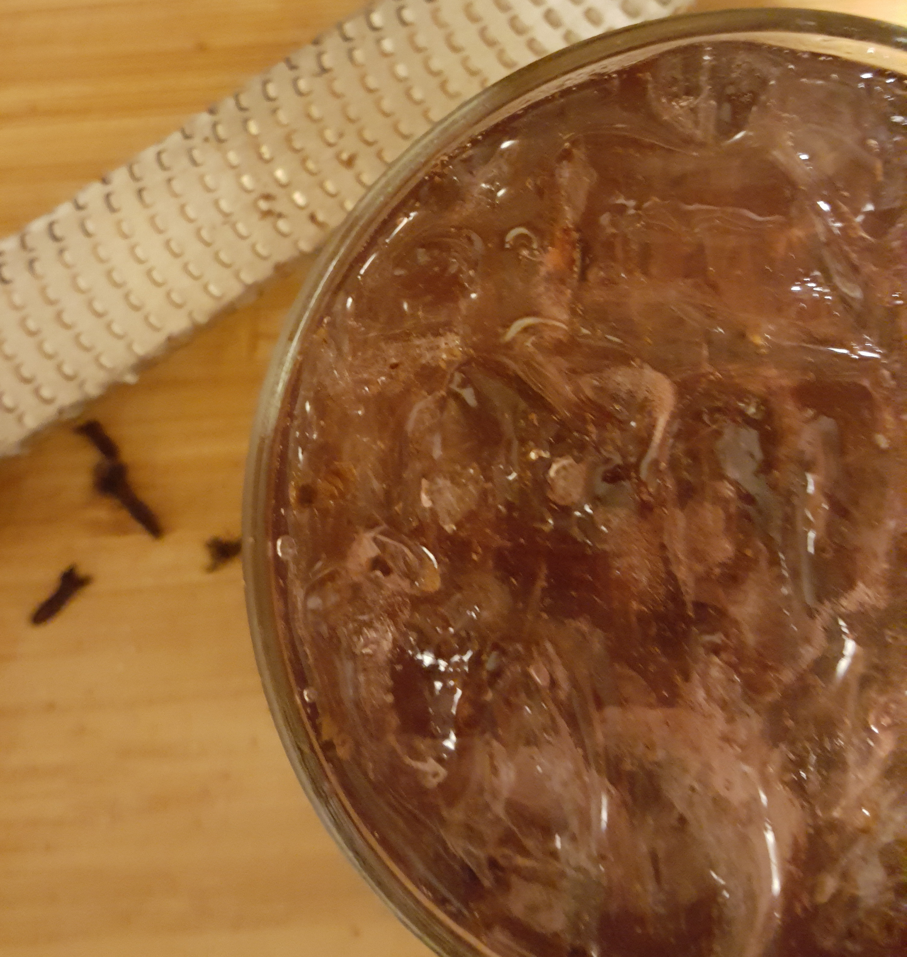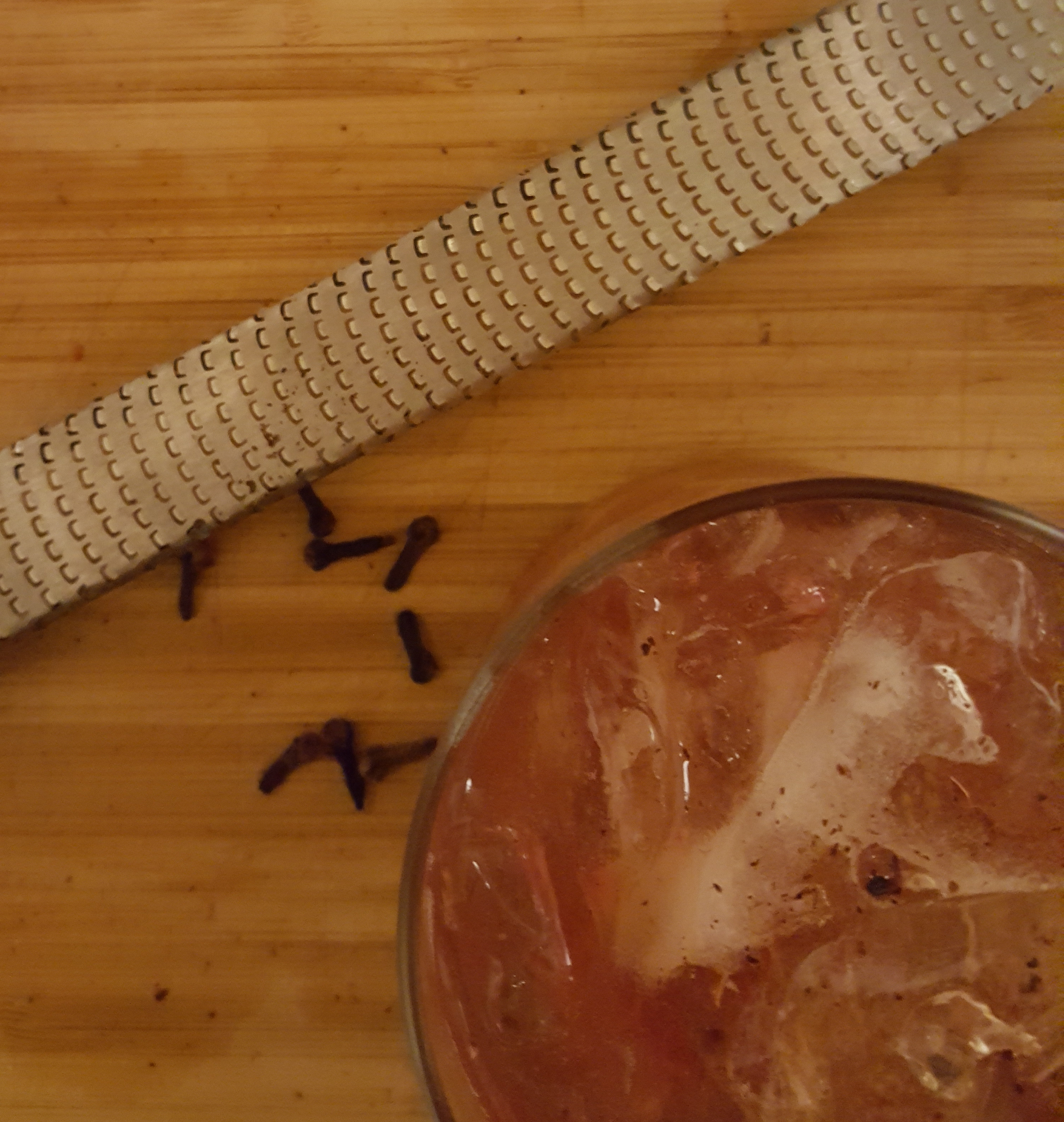 In a rocks glass, muddle a handful of raspberries. Add ice, 1.5 oz whiskey, and .75oz sweet vermouth. Cover with soda, and using a microplane or grater, shave a clove or two into the drink.