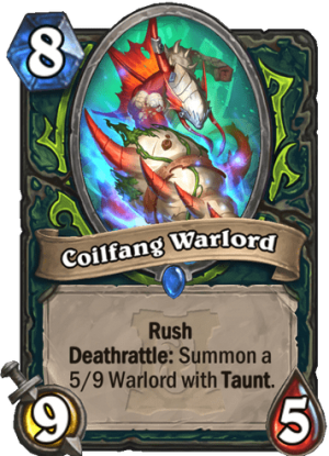 Everyone should remember Burly Shovelfist — another Rush minion with nine points of attack — and its impact on the game. Coilfang Warlord for the Demon Hunter class is better, and it's one mana cheaper than Shovelfist.