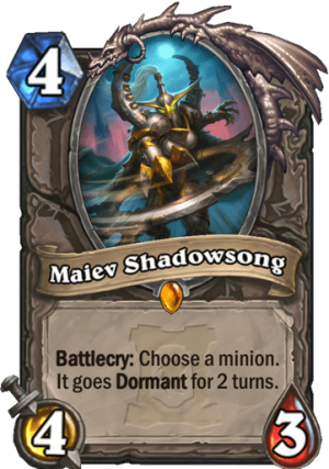 Since Ashes of Outland has introduced a number of dormant minions with some very useful triggers after they awaken, Maiev Shadowsong will be able to re-trigger those effects and bring a lot of value to the board.